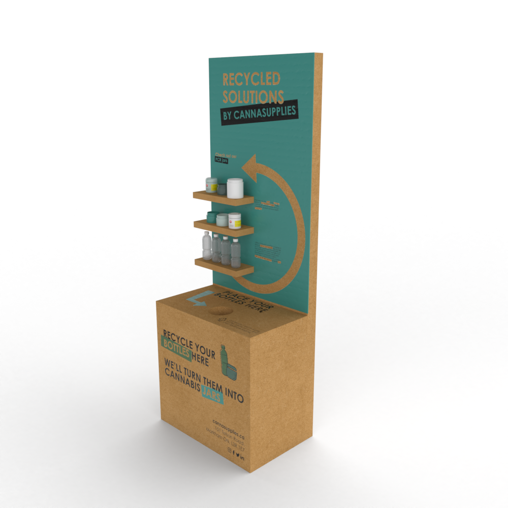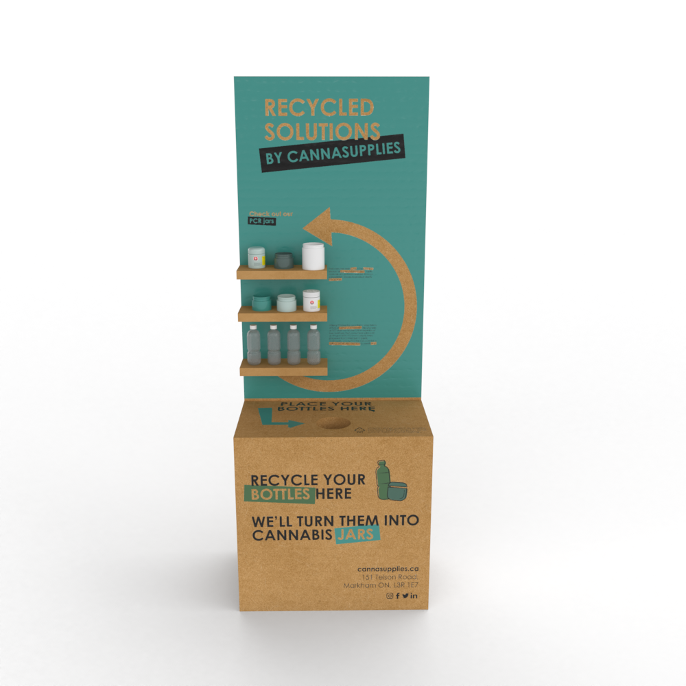 It's obvious a lot of cannabis packaging is made of plastic, which is often associated with having a negative impact on the environment. I created this display booth to shed new light on the creation of our PCR jars. The booth educates customers on how they can continue to use plastic and become environmentally conscious. Customers are welcome to recycle their used water bottles in the display, which eventually will become PCR jars and bottles. The display is made from recycled carton boxes, playing off of the 'recycled solutions' concept.