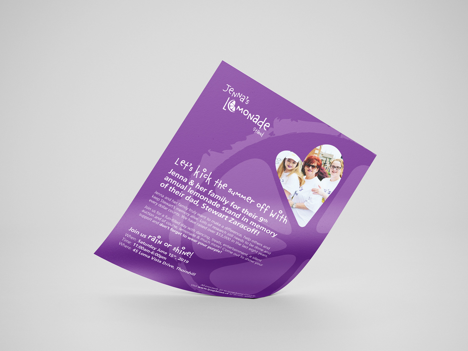 Jenna’s Lemonade Stand is an annual fundraiser held by the Zaracoff family in honour of their father who passed away from Lymphoma. The fundraiser attracts hundreds of members from the community for a fun-filled day of entertainment, dancing, treats and of course—lemonade. The annual event has raised over $50,000. To celebrate the eight year mark, the Zaracoff family wanted to revive the look of the visuals.